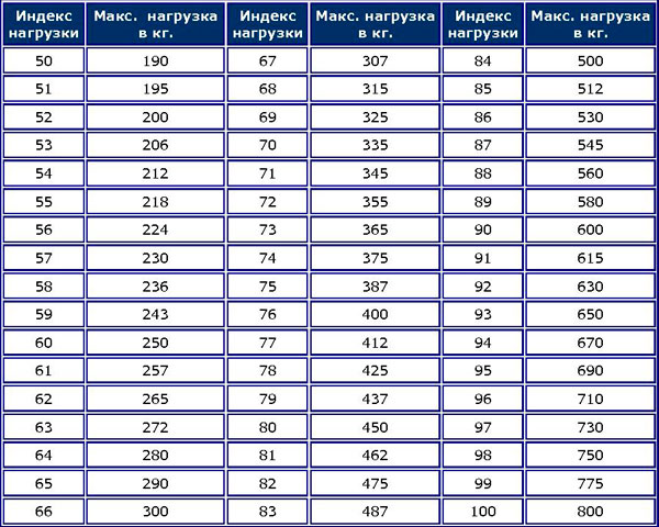 Таблица индексов нагрузки шин. Индекс допустимой нагрузки (или индекс